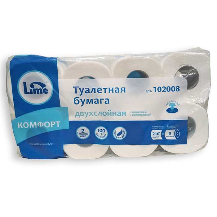 Рулонная туалетная бумага в упаковках по 8 рулонов для внедомашнего использования Lime - это наиболее экономичное и эффективное решение, которое может c одинаковым успехом применяться как в санузлах со средней проходимостью, так и в туалетных комнатах с низкой проходимостью.